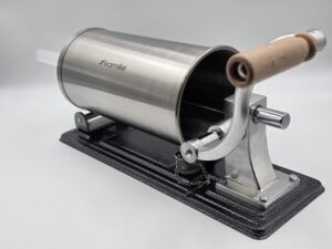 Stabilność: Dzięki długiej podstawie, nadziewarka pozioma jest bardzo stabilna podczas kręcenia korbą, nawet przy bardzo gęstym farszu (np. na kabanosy).