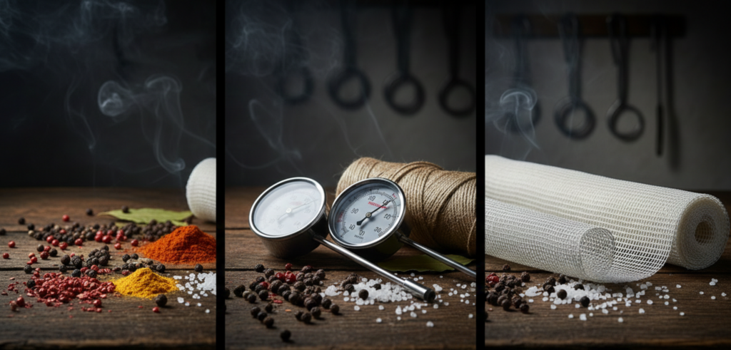 Wszystko, czego potrzebujesz na start: siatka, termometr, peklosól i autorska mieszanka przypraw.