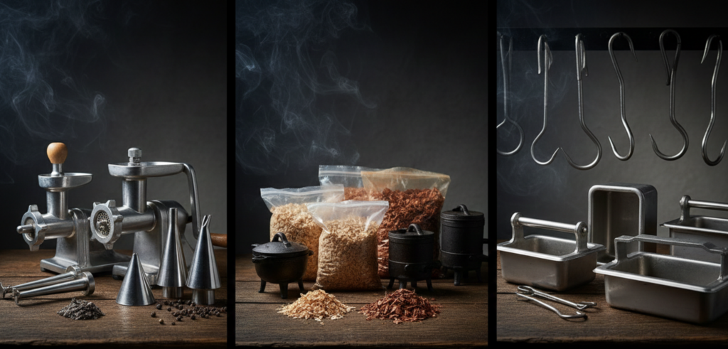 - 📐 Akcesoria: Termometry, haki, siatki wędzarnicze oraz wytrzymałe sznurki.
