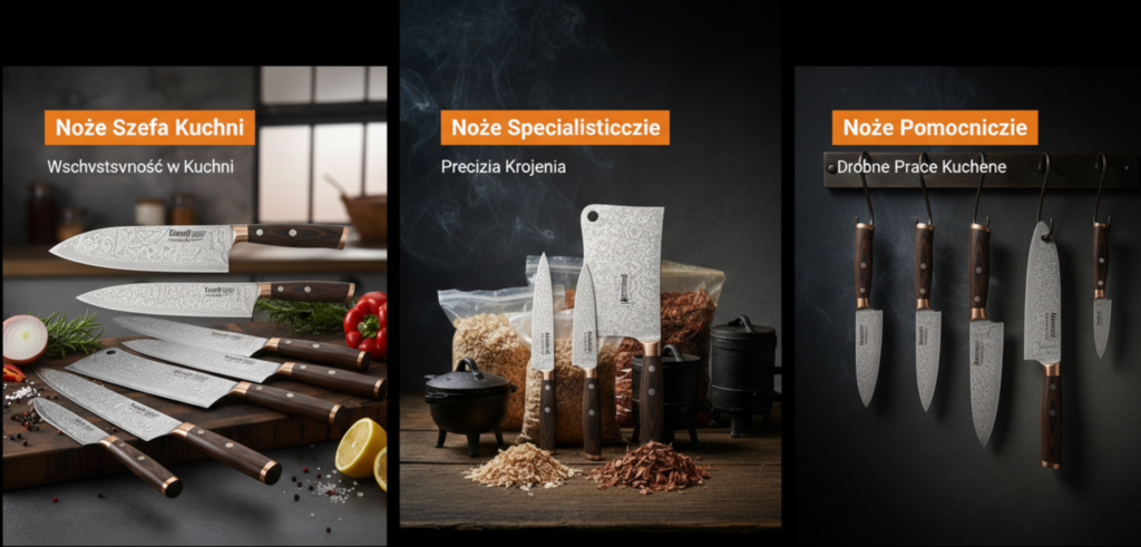 | Nóż do trybowania | Wąskie, elastyczne lub sztywne ostrze o długości ok. 13-15 cm. | Oddzielanie mięsa od kości, usuwanie ścięgien i chrząstek. |
